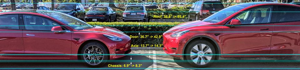 Self-professed Tesla fan Bob Silvern took the photo above and rotated the picture a few degrees to the wheel bottoms of both vehicles were on a horizontal grade. From there, Silvern drew some horizontal lines based on the Model 3 spec height of 56.8″, and compared it to the Model Y.
