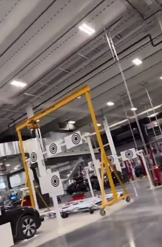 The next part of the factory we see is where the newly built vehicles are parked and tested, including calibration of the vehicle’s cameras.