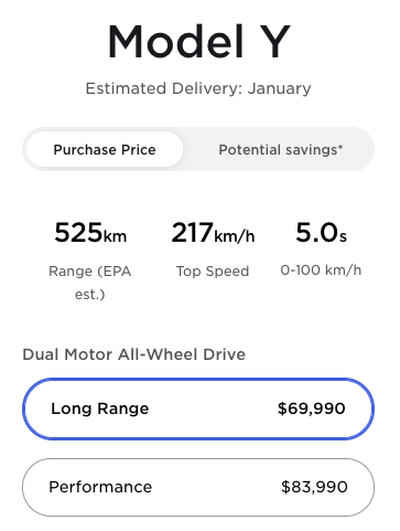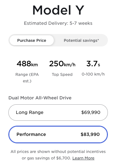Just two weeks ago, Tesla began estimating a December 2021 delivery timeframe for new orders. If you want a Model Y quickly, you will either have to find one used or be prepared to pay extra for the Performance variant, which you can have in driveway in 5-7 weeks.