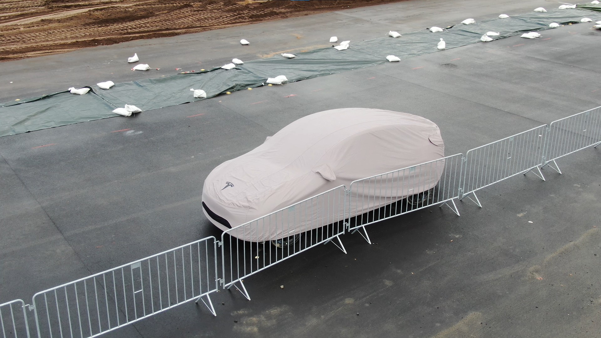 The Model Y did not have a license plate, and had clearly been driven on the dirt test track just a few meters away from where it was parked.