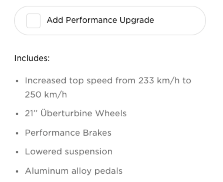 After today’s update, first spotted by Drive Tesla reader Kaushik Krishna, that range has been increased to 468km, and the free optional “Performance Upgrade” package has been removed from the Design Studio.