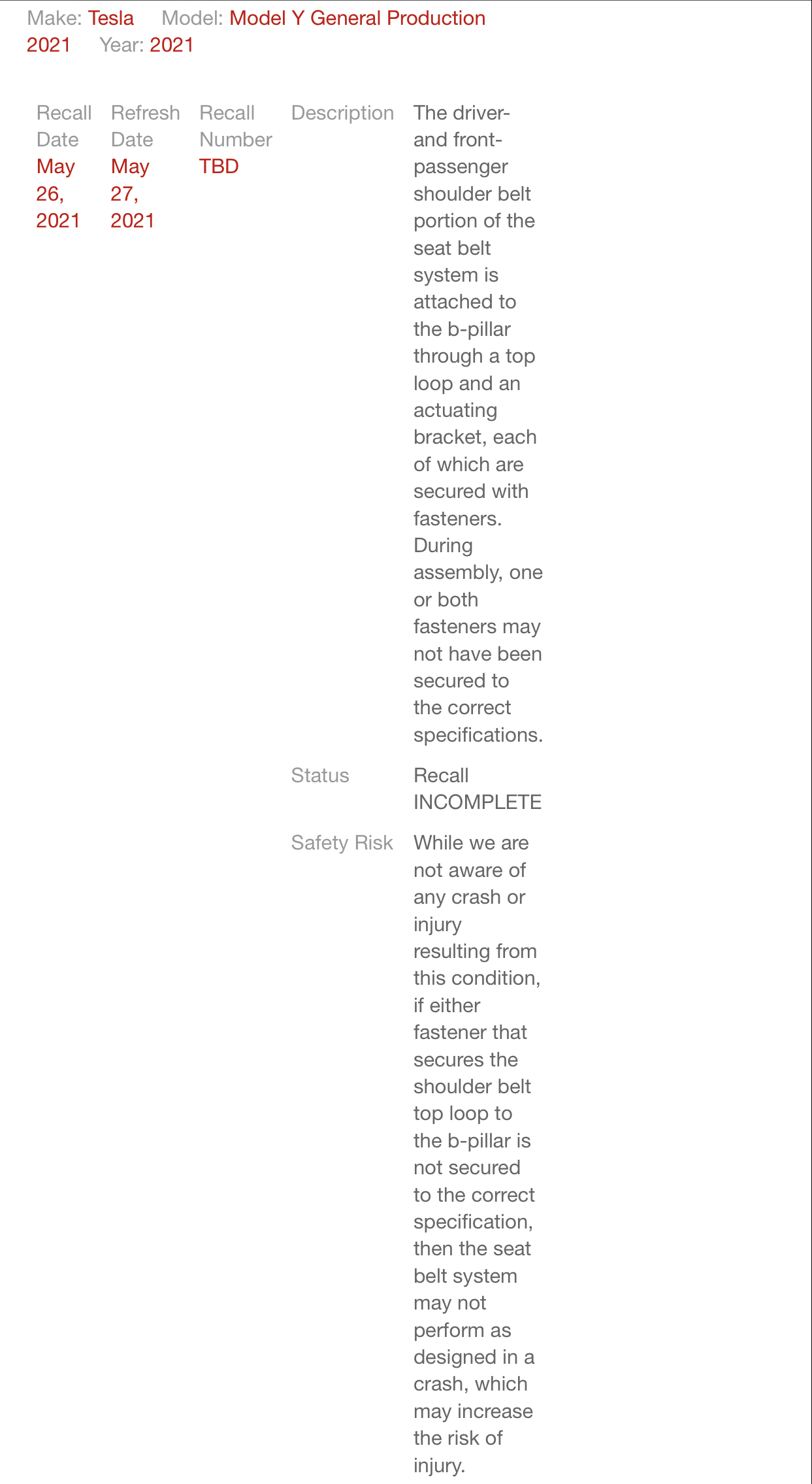 UPDATE: This recall has now been posted by the NHTSA. It includes some 2019-2021 Model Y vehicles, and also includes some 2018-2020 Model 3’s, for a total number of 5,530 impacted vehicles.