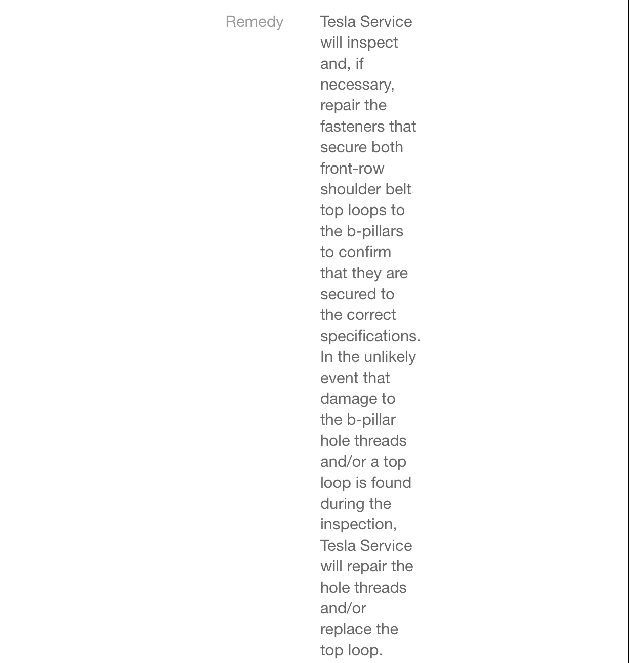 According to the description of the recall on Tesla’s website, the front driver and passenger seat belts are attached to the bi-pillar “through a top loop and articulating bracket.” Each of these are then secured with a fastener.