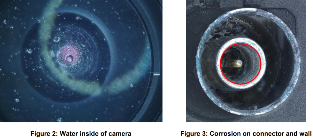The bulletin explains that water may enter the front camera assembly through channels in the front fascia wiring harness. If moisture reaches the camera housing or connector, it can lead to corrosion or cause the camera lens to become partially submerged.