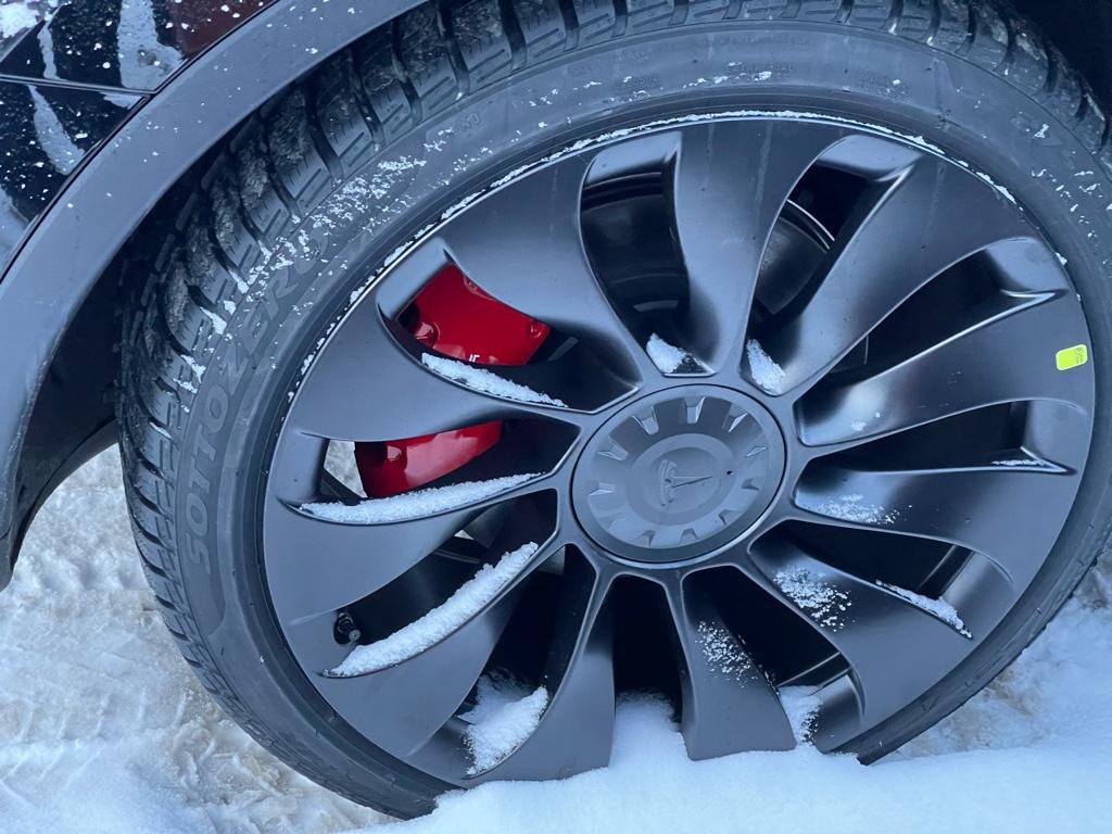 The German-made car was photographed by @TeslaAnders showing it as a Gigafactory Berlin license plate (M-GF), 21″ Uberturbine wheels and signature red brake calipers.