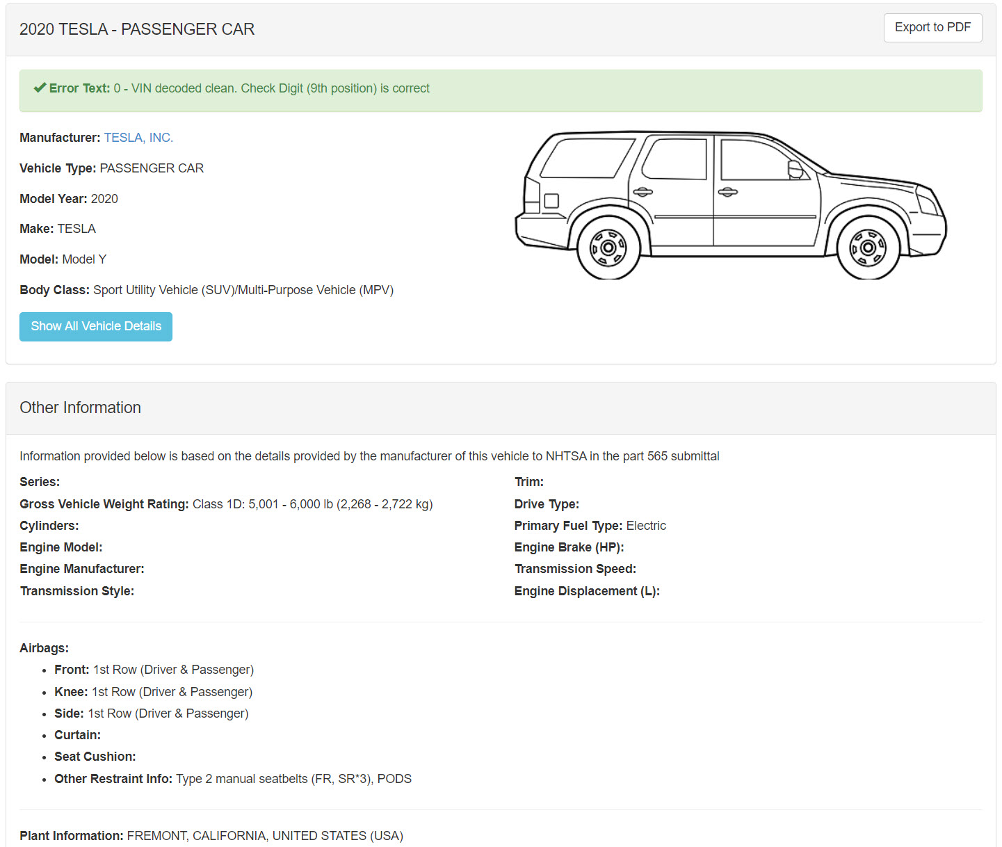 Using the VIN that was spotted on a Model Y prototype in California, 5YJYGDEF5LFR00594, we can enter it into the decoder, which gives us the following information about the vehicle.