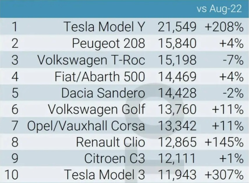 Tesla Model Y has once again become the best-selling car in Europe. In August, the company managed to sell 21,549 units, up 208% compared to the same period last year. The SUV was out of competition as its closest competitor, Peugeot 208 with 15,840 sales, lagged behind by an impressive 5,709 units. Volkswagen T-Rock is in third place with 15,198 units. Fiat/Abarth 500 with 14,469 units and the Dacia Sandero with 14,428 are in fourth and fifth place respectively. Notably, Tesla Model 3 also saw a significant increase in sales compared to the same period last year, ranking 10th on the list with 11,943 units sold.