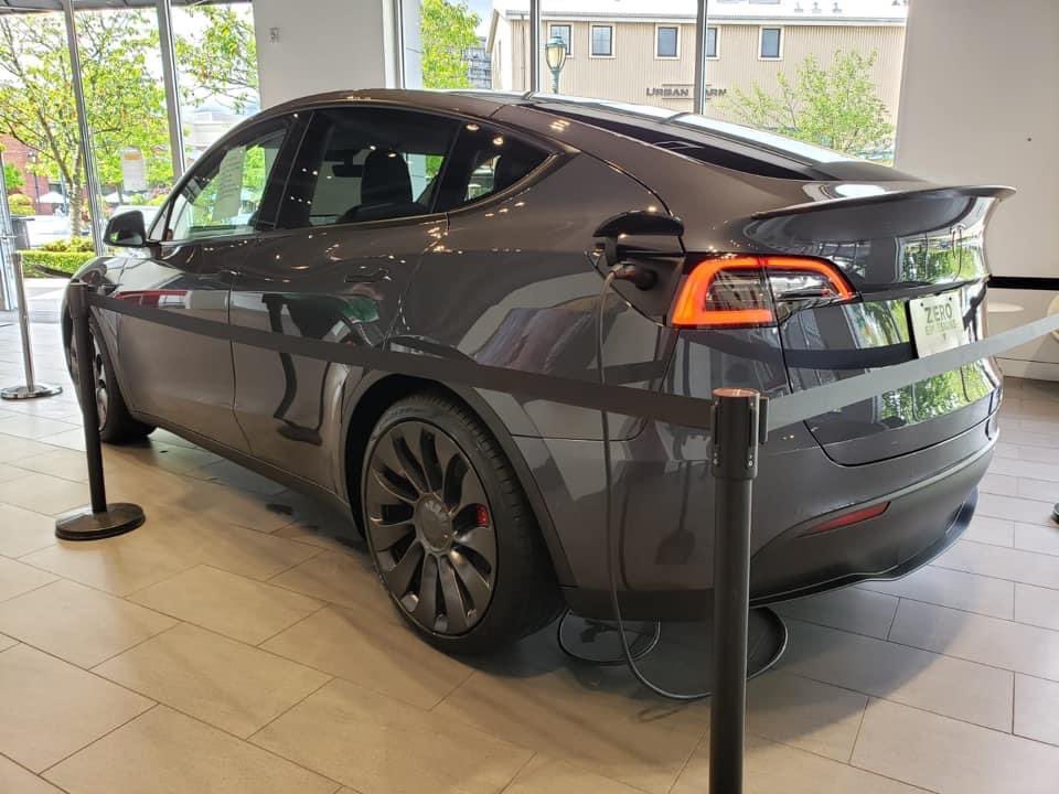 If you’re in Vancouver, the one you’ll probably want to check out is the White Model Y also with 21″ Überturbine wheels in the West 4th showroom. This one is not roped off, and you are allowed to check out the interior of the spacious electric SUV.