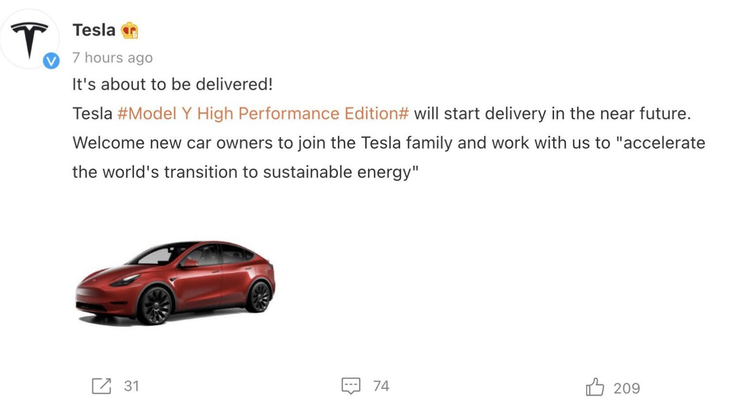 Exciting news for Model Y Performance reservation holders in China.#Tesla #TeslaChina #ModelY $TSLA pic.twitter.com/G0tuypRsMv
