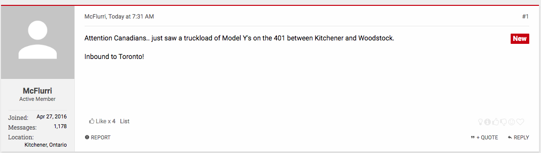 There have been two independent reports of a carrier truck full of Model Y’s travelling along Highway 401, spotted between Kitchener and Woodstock, Ontario. One was posted to the TMC forum, and the other was posted on Facebook. Those were both reported in the early morning hours today, around 7:30am PST, and said the truck was heading east, possibly towards Toronto.