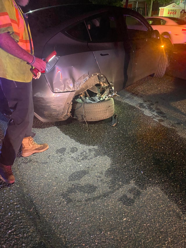 Despite little traffic on the road and ample time to avoid a collision, the driver swerves at the last second (and doesn’t slow down), impacting the right rear side of the Model Y, resulting in the right rear wheel being completely torn off the vehicle.