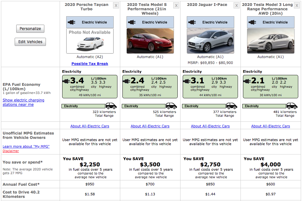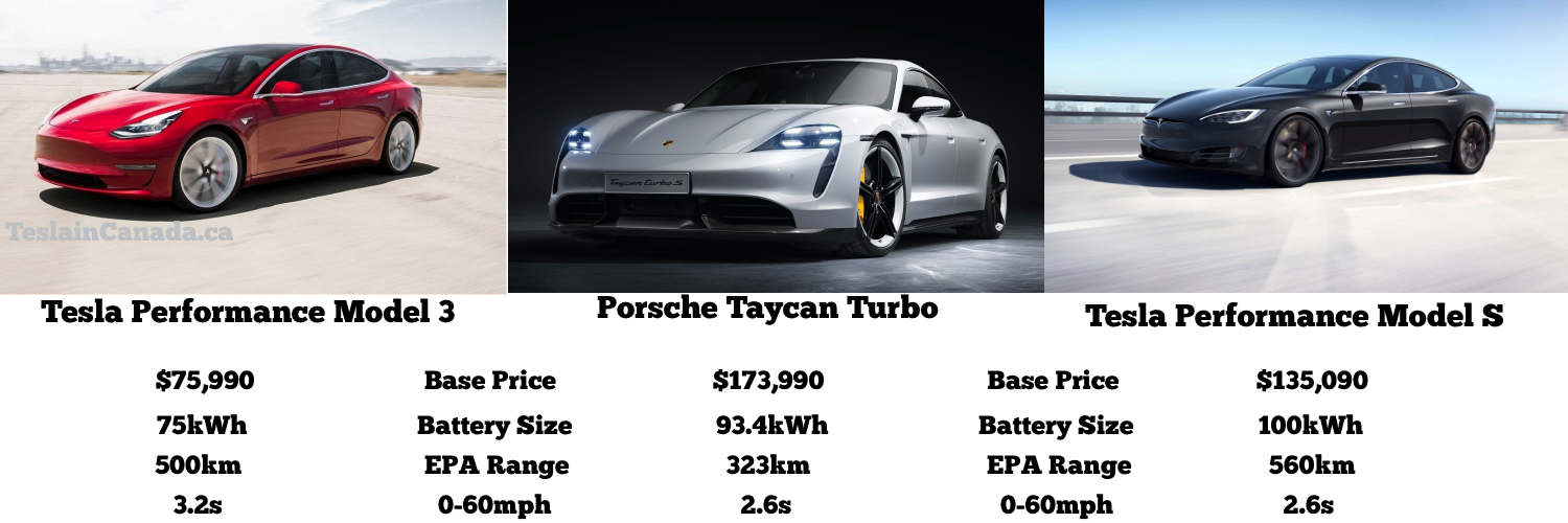 Compare that to the other two luxury electric vehicles in its class, the Jaguar I-Pace and Audi e-tron, and it sits at the bottom of the pack. The Performance Model 3, which is more than $100,000CDN cheaper than the Taycan Turbo ($75,990CDN vs. $173,900CDN) with similar performance stats, gets 160km more in range than the Taycan Turbo from its smaller 75kWh battery.