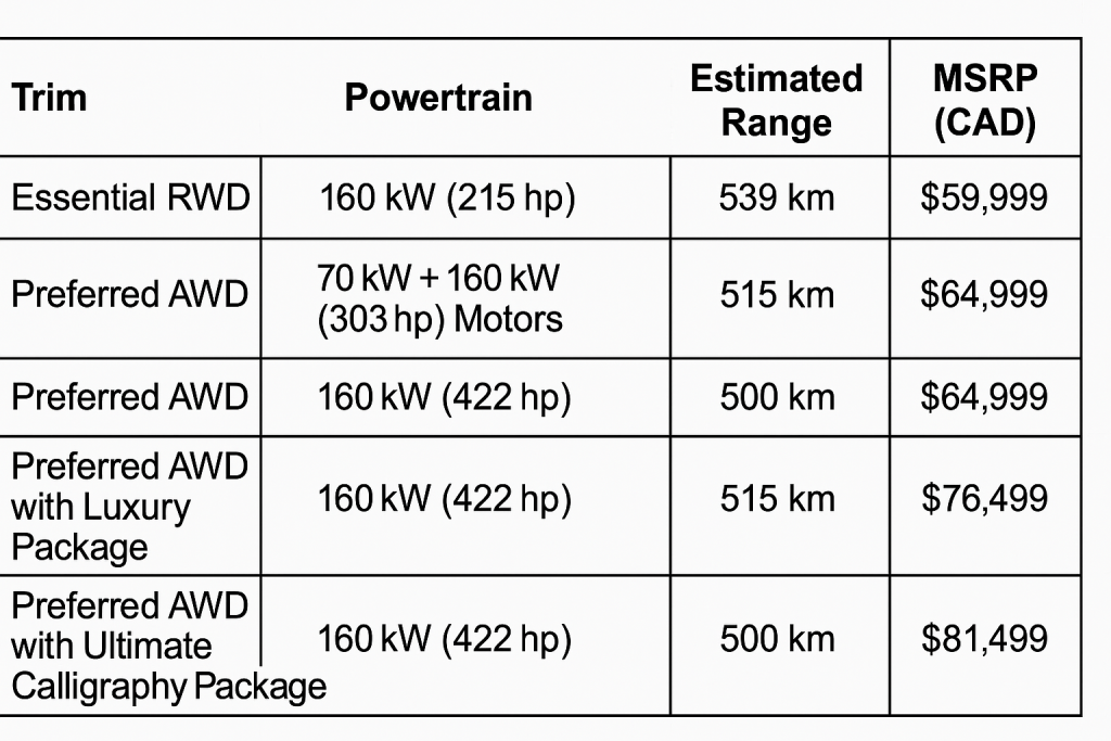 Higher trims include the Preferred AWD with Luxury Package at $76,499 and the fully loaded AWD+ with Ultimate Calligraphy Package at $81,499. Delivery and destination charges of $2,050 are additional.