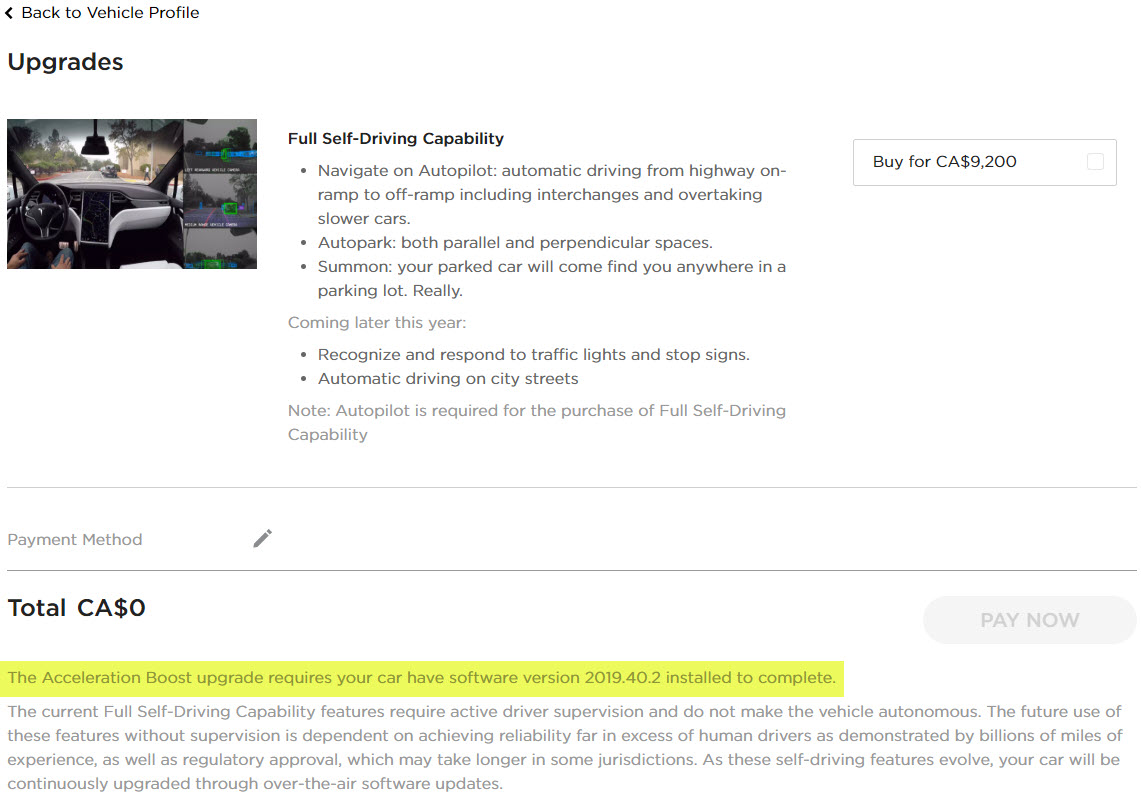After logging in to your Tesla account, and going to the upgrades section, it still only shows the option to upgrade to Full Self-Driving (FSD), currently at a price of $9,200 in Canada. But if you look at the fine print below the PAY NOW button, you’ll see a new section there that mentions the Acceleration Boost upgrade.