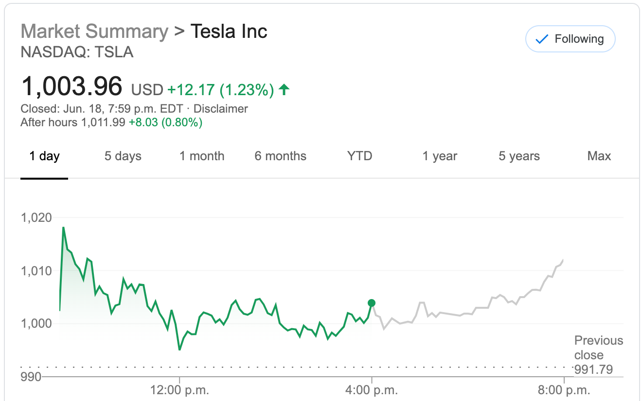 Tesla shares (TSLA) were up 1.23% yesterday, closing near an all-time high of $1,003.96.