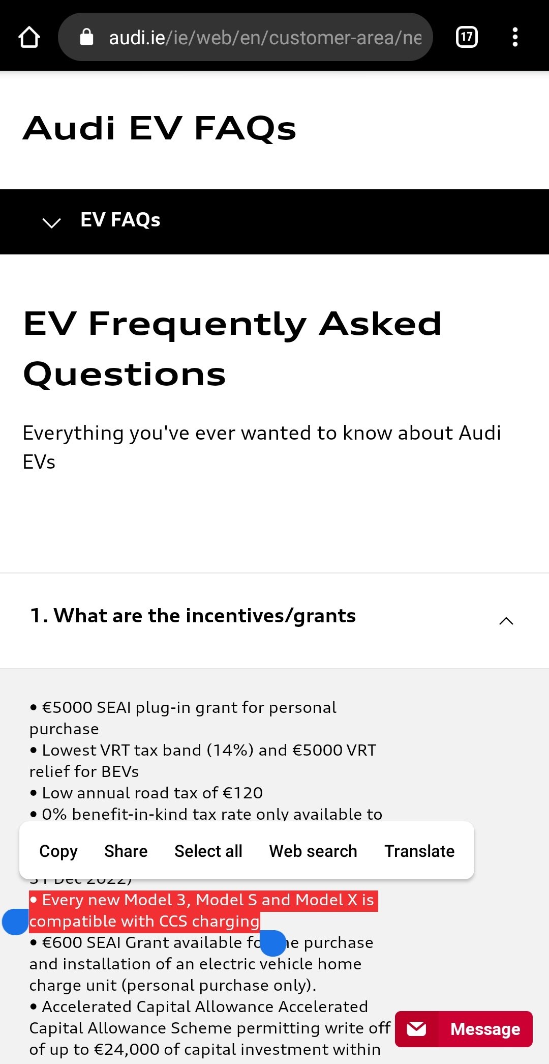 Upon closer inspection, and after visiting Tesla’s website, he discovered that someone had simply copied nearly the entire text of Tesla’s page on vehicle incentives, and pasted it into Audi’s page about incentives and grants available for EV purchasers.