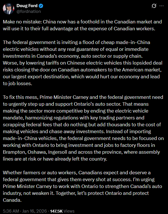 Not everyone in Canada is cheering on the deal. Ontario Premier Doug Ford warned on X the agreement risks giving China a foothold in Canada’s auto market and could complicate access to the U.S., Canada’s largest export destination. He argued the deal threatens Canadian manufacturing jobs unless paired with stronger protections for domestic automakers.