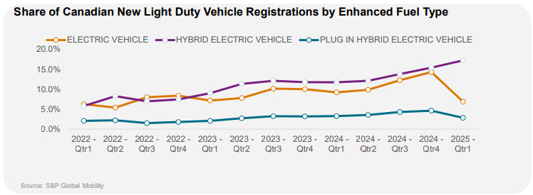According to new data released by S&P Global Mobility on Thursday, ZEVs accounted for just 9.7% of new light-duty vehicle registrations—down significantly from 18.9% in Q4 2024 and 12.5% in Q1 2024.