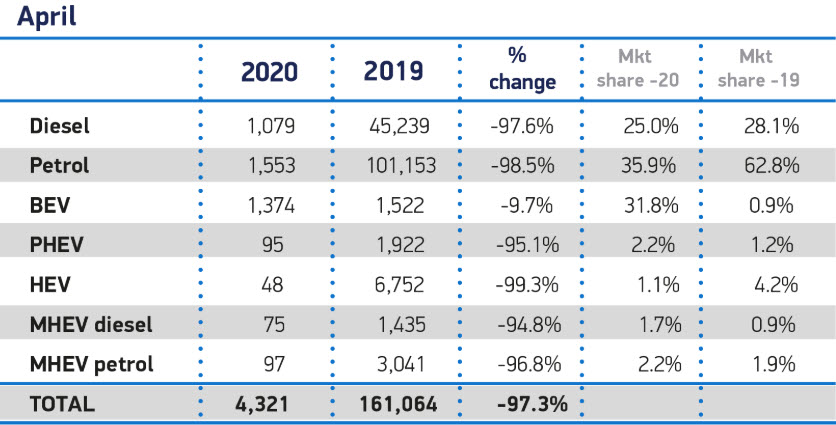 Overall car sales were down 97.3% with just 4,321 sales being registered. That compared to April 2019 which saw 161,064 sales of new vehicles. But again, battery electric vehicles (BEV) were the strongest performers, seeing a more moderate decline of just 9.7%.