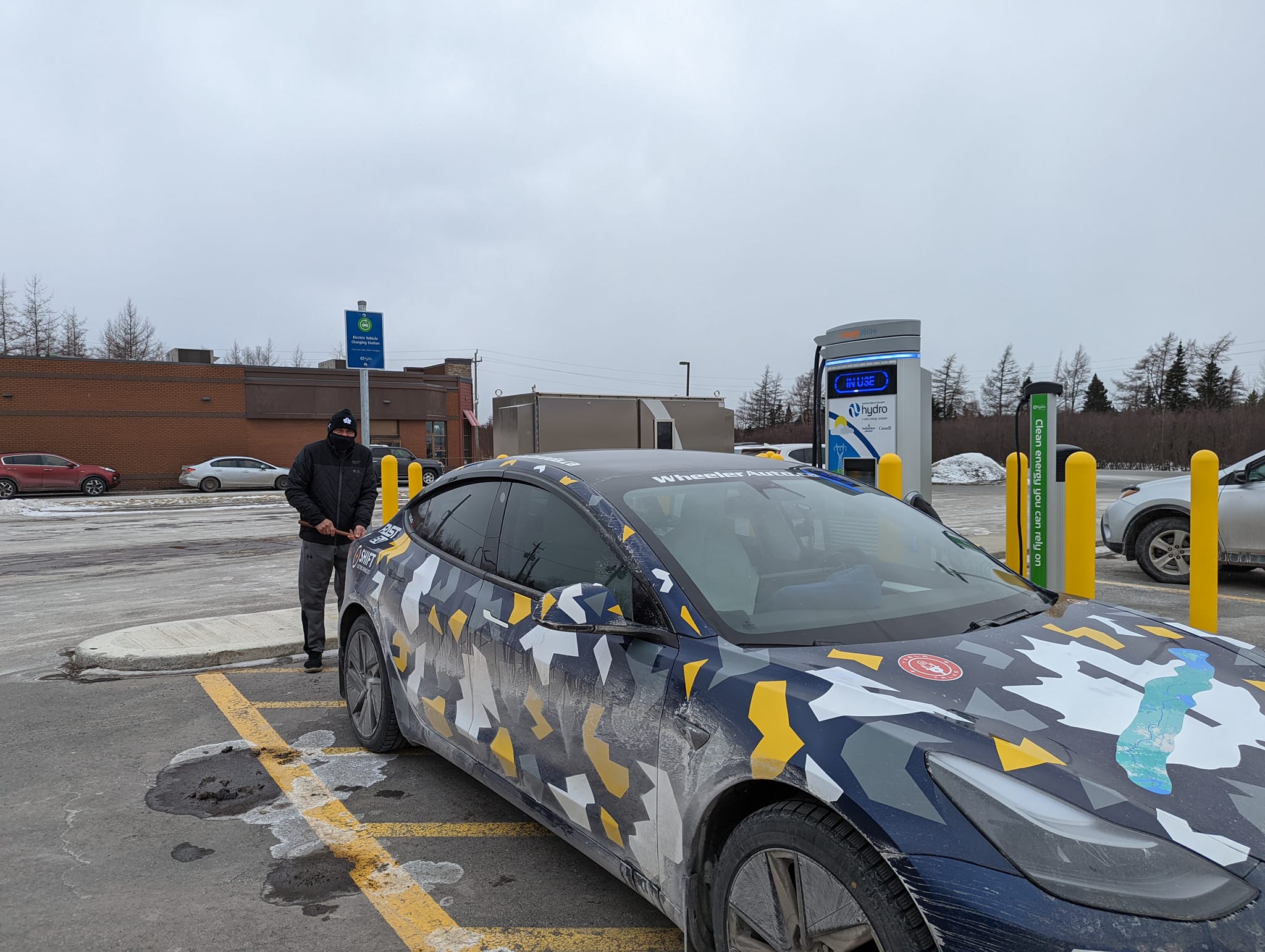 This is Cyril’s idea of washing the car. We have decided to make this a shorter charge and head to Deer Lake where we will have a very late lunch while we charge up for a run to the ferry. These slow chargers do make it harder to travel if you’re in a hurry but we’re getting there. It’s starting to snow and Cyril Wheeler started crying so I’m going to drive.