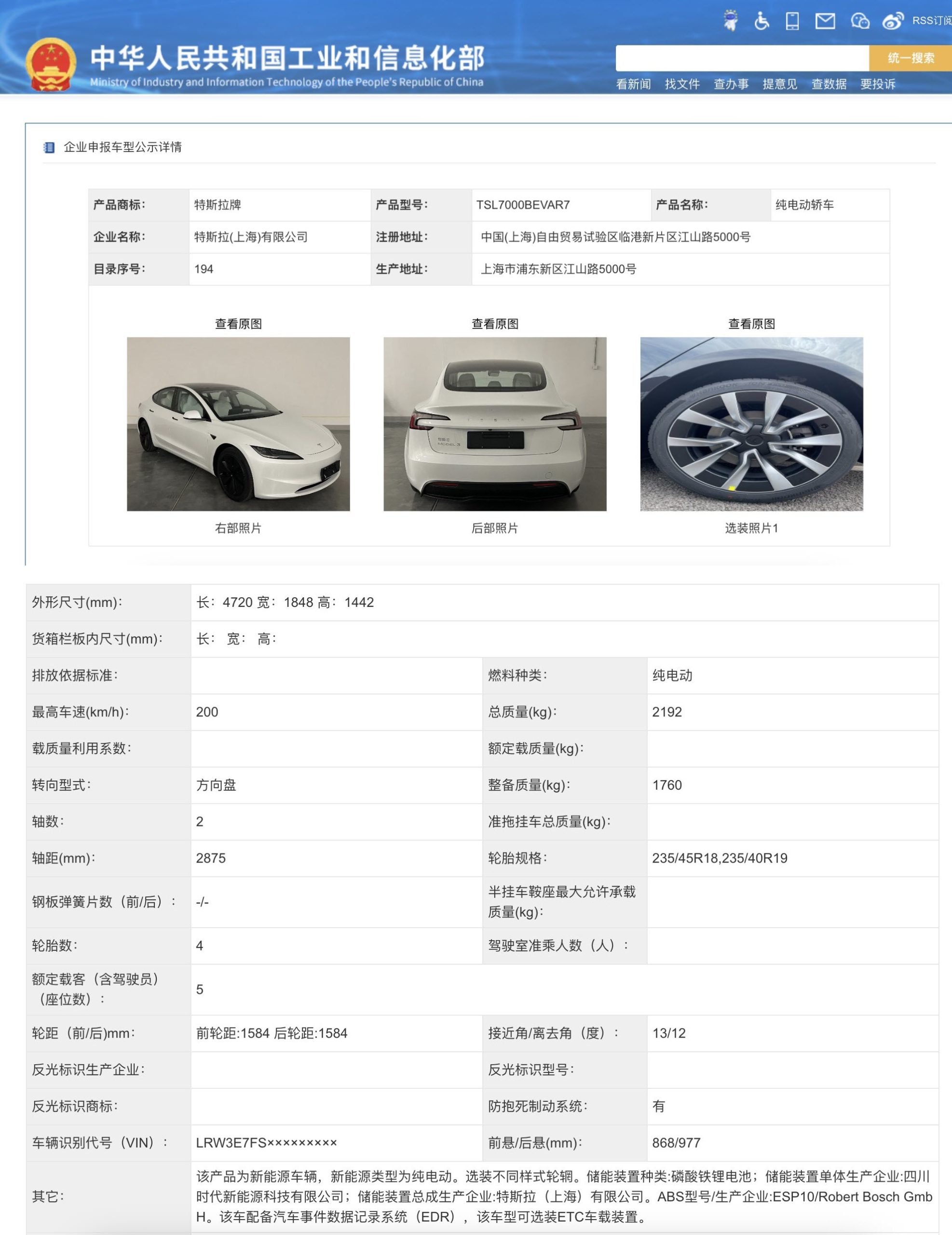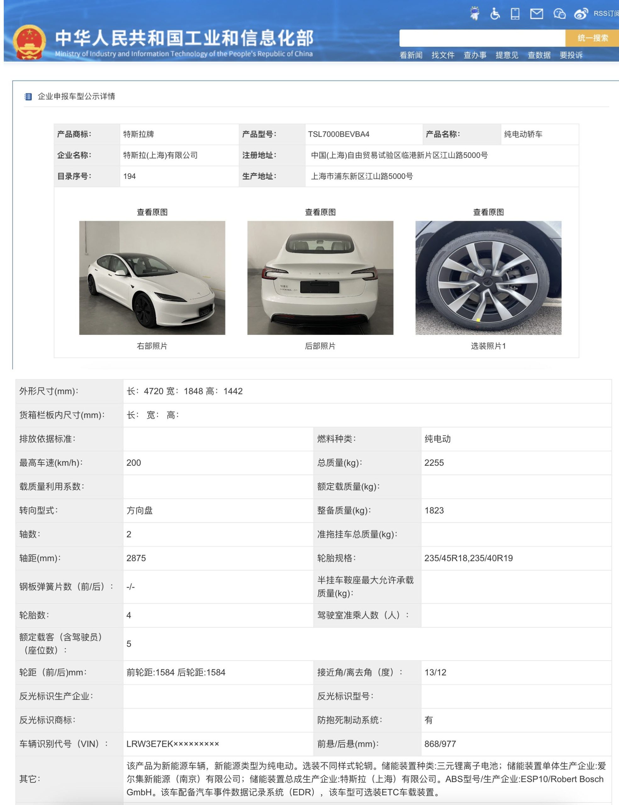 According to the official documents posted to the Ministry’s website on Tuesday, the dimensions of the two Model 3 variants listed are the same at 4,720mm length, 1,848mm width, and a height of 1,442mm. Both have a top speed 200km/h (125mph), both have the same wheelbase at 2,875mm, but they differ when it comes to listed weights.