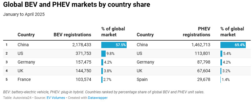 China has solidified its position as the world’s largest electric vehicle (EV) market, accounting for the majority of global battery electric vehicle (BEV) registrations in the first four months of 2025, and it wasn’t even close.