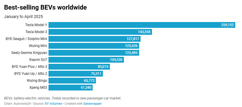The BYD Seagull (also known as the Dolphin Mini) ranked third worldwide with 127,817 registrations, followed closely by the Wuling Mini EV and Geely Geome Xingyuan, each securing over 125,000 sales. Notably, several Chinese automakers placed multiple models in the global top 10, underscoring the country’s dominance not only in total volume but also in model diversity.