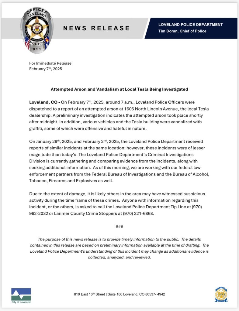 Tesla has its fans and haters, and the latter have struck again. The EV maker has suffered vandalism to its store and product in Colorado, according to the Loveland Police Department. The most recent incident involved a fire that was reported at the location at 1606 North Lincoln Avenue at 7:00 a.m.