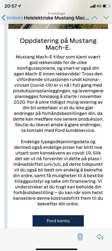 As you know, Mustang Mach – E offers very good range for the various configurations, and soon your own Mach – E is within reach too! Despite the challenging situation around the corona virus (covid – 19), we are now in full production planning and deliveries are scheduled to start in November 2020. To ensure the earliest possible delivery of your car, we recommend that you do not make changes to your pre-order, as this may result in some later production. If you still want to make changes, contact Ford customer service.