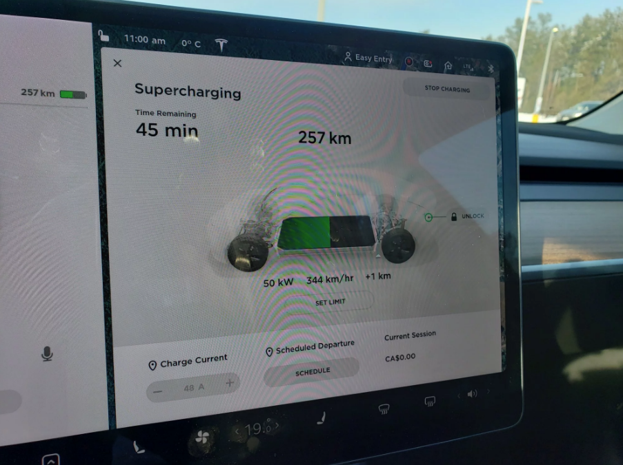 One location that didn’t show up on the map as open was Deep River, Ontario, a 6 stall V3 Supercharger site. It has now been confirmed to be open, with TMC member KenziEE posting this photo of his Long Range RWD Model 3 charging and getting a limited 50kW charge, good for about 345km/hr.