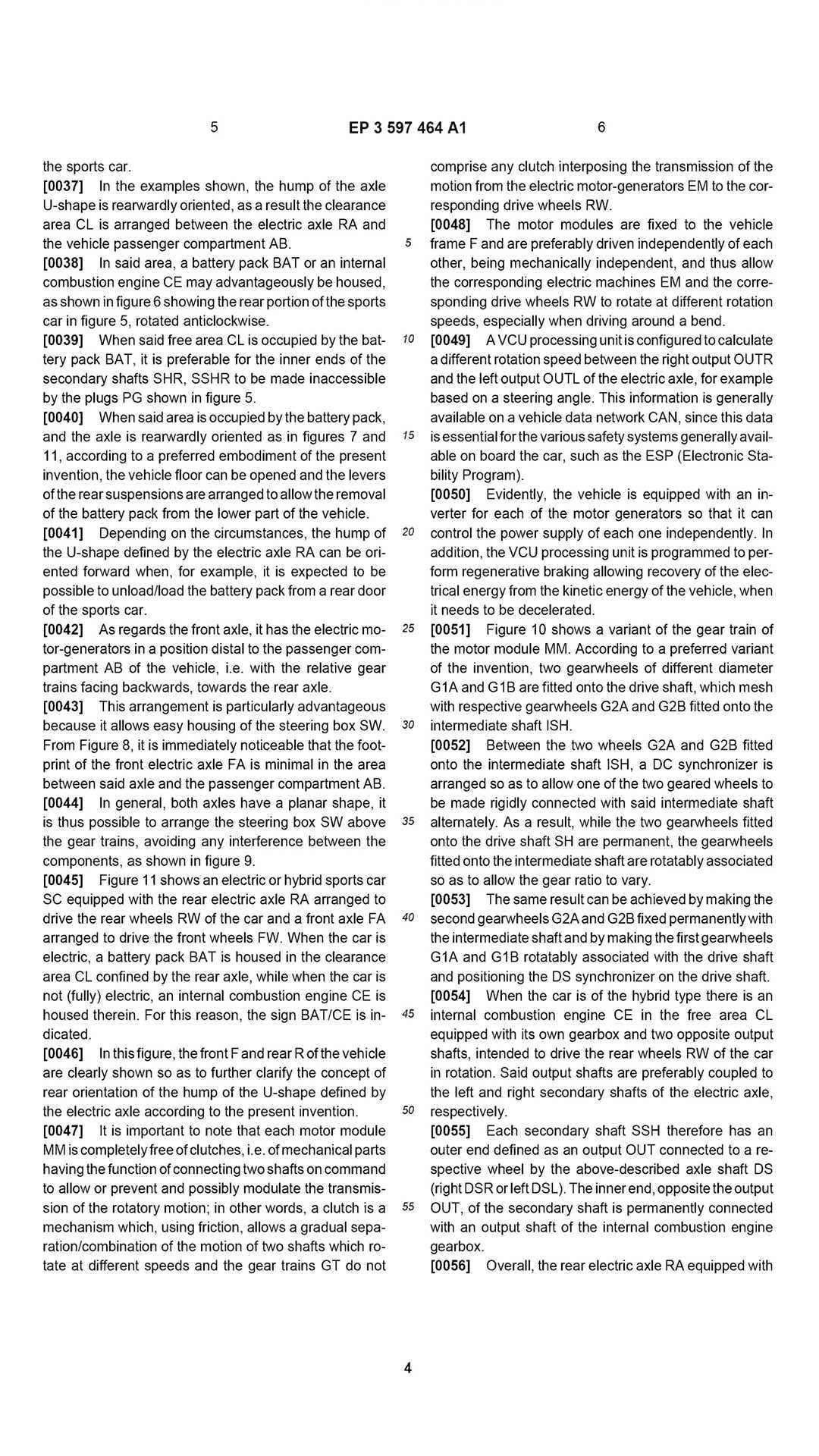 “When the car is electric, a battery pack BAY is house in the clearance area CL confined by the rear axle, while when the car is not (fully) electric, an interanl combustion engine CE is housed therein.“