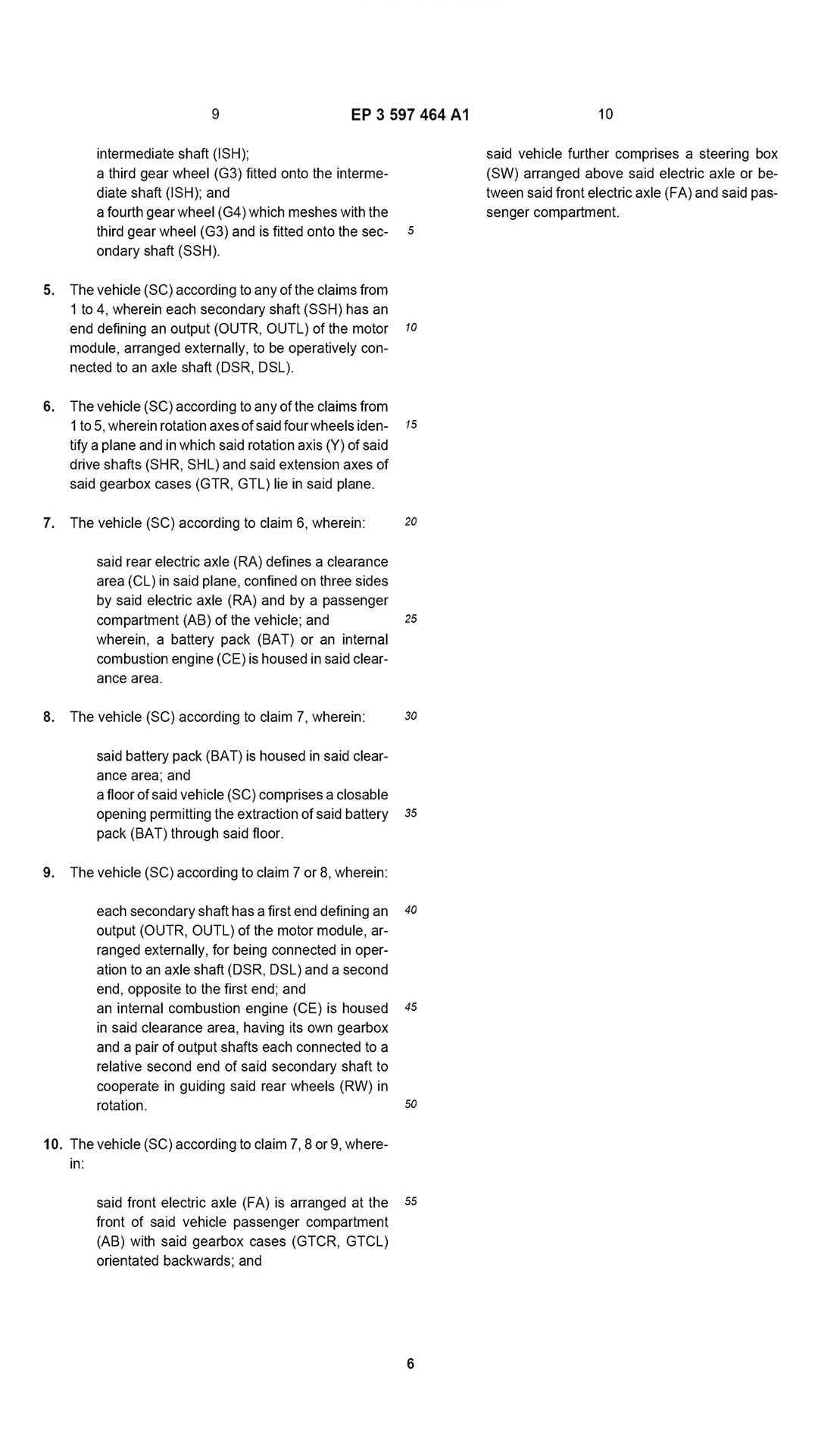 “When the car is of the hybrid type there is an internal combustion engine CE in the free area CL equipped with its own gearbox and two opposite output shafts, intended to driver the rear wheels RW of the car in rotation.“