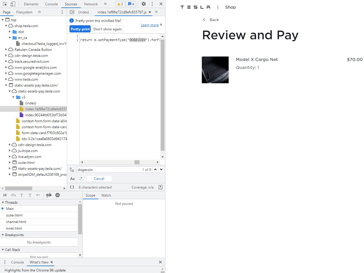 After checking the source code of the Tesla Shop, we were able to verify that Dogecoin is also included there.