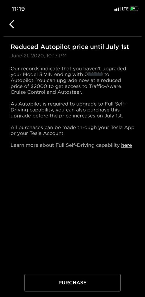 Enabling basic Tesla Autopilot via Tesla in-app purchase is reduced to $2k until July 1
