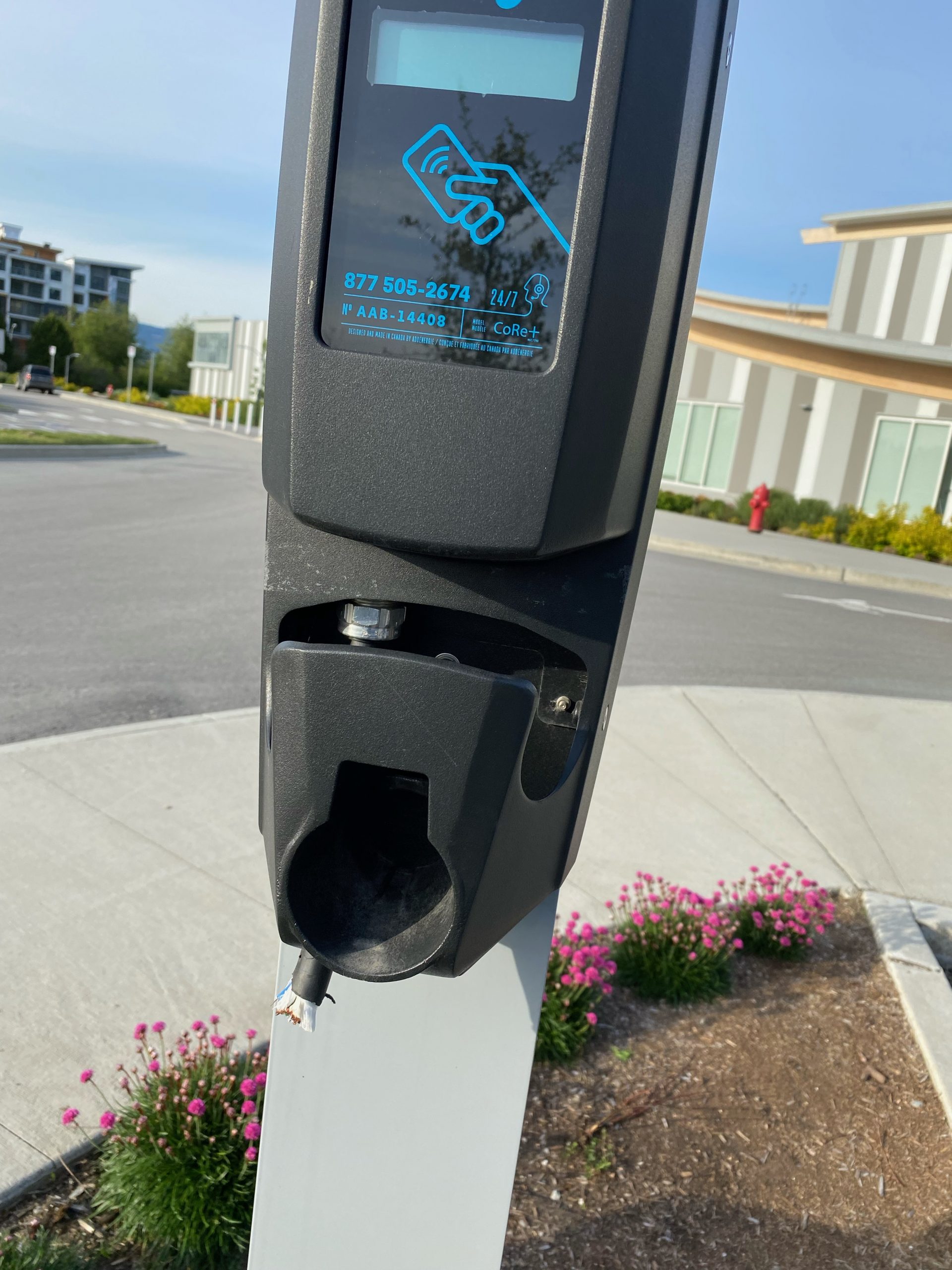 The recreation center has one charging station with two stalls operated on the FLO network. Sometime in the last week both charging cables were severed just inches away from the pedestal.