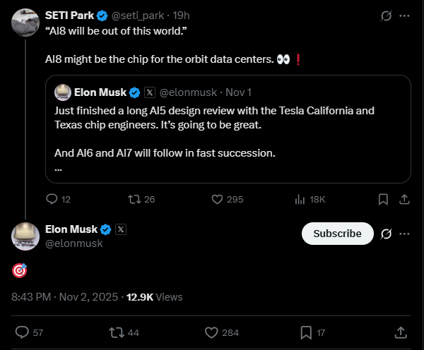 The final part of Musk’s post — that “AI8 will be out of this world” — hints at even broader ambitions. Whether metaphorical or literal, the phrase may allude to a future integration of Tesla’s AI systems with SpaceX or xAI, potentially enabling off-Earth capabilities, a possibly Musk seemed to hint at by replying to a post suggesting AI8 will be for orbital data centers.