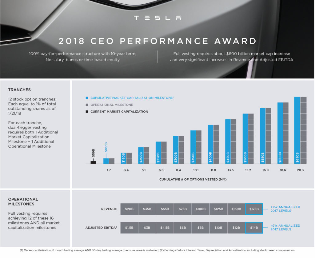 As part of his 2018 CEO performance agreement, Musk receives tranches of stock options when the company passes specific milestones.