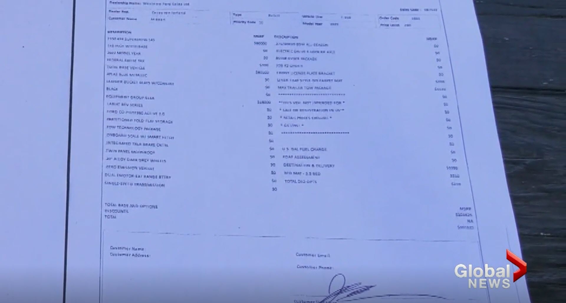 Jason and Melanie Bean from Vancouver Island told Global News they were called in to their local dealer on January 8 to configure their electric truck. Once there they did just that and signed a “preview order,” which included a detailed breakdown of their specific configuration, and a price of $101,625.