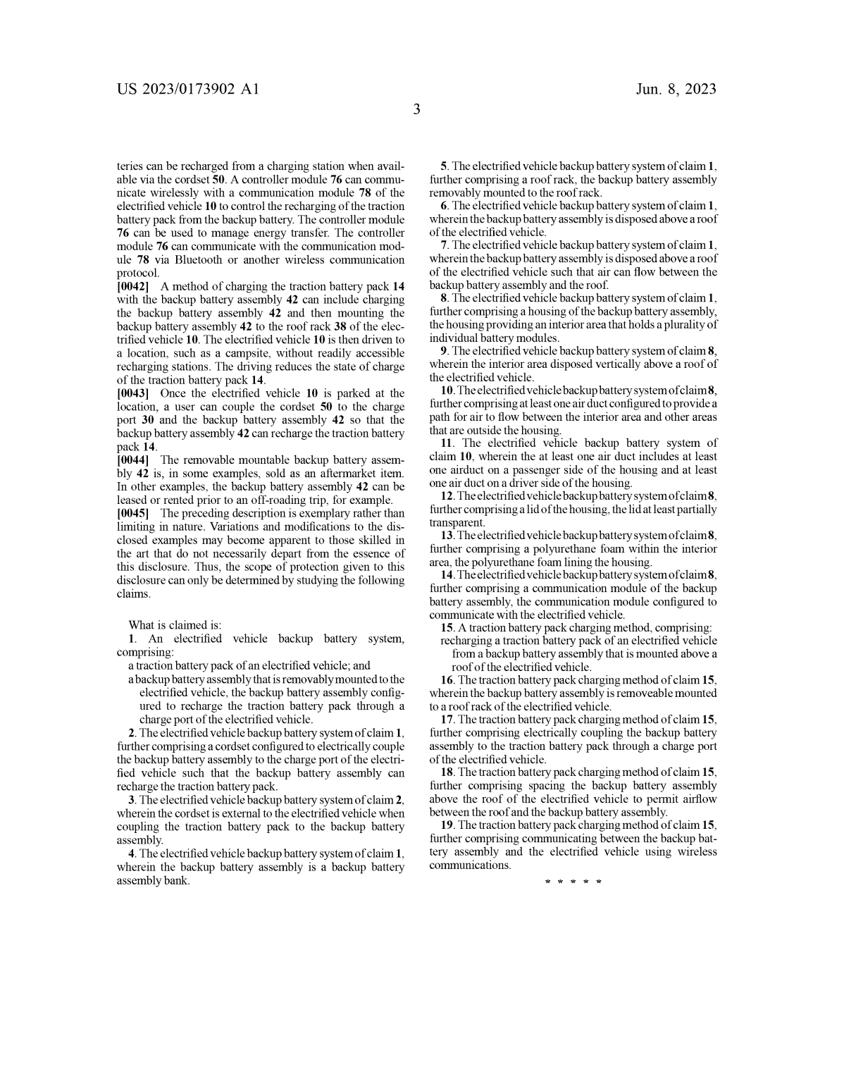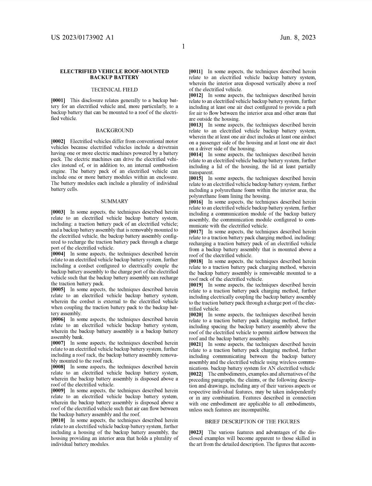 Once you have reached your location, “such as a campsite,” the EV owner would take the included charging cord from the backup battery and plug it in and charge the EVs main battery. Ford goes on to explain the backup battery, while mounted to the roof in the application, could “mount to other areas of the electrified vehicle,” without providing other examples.