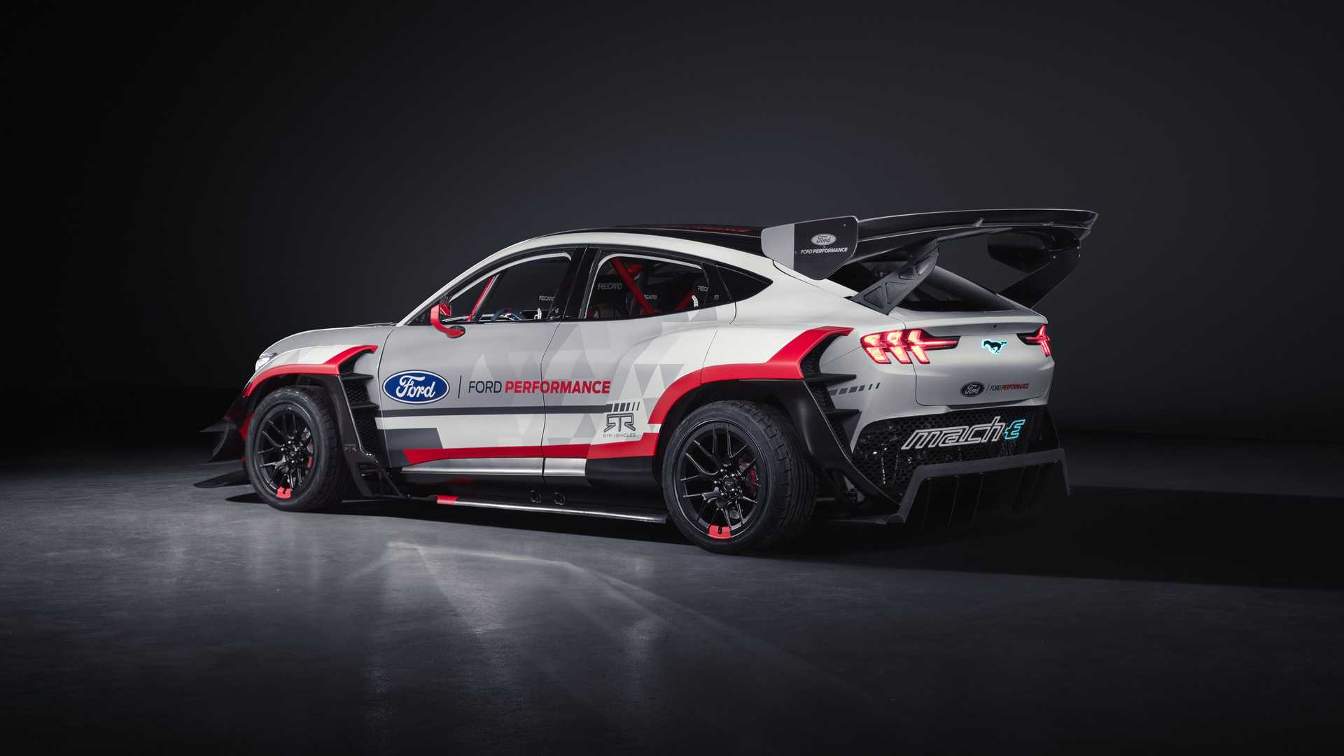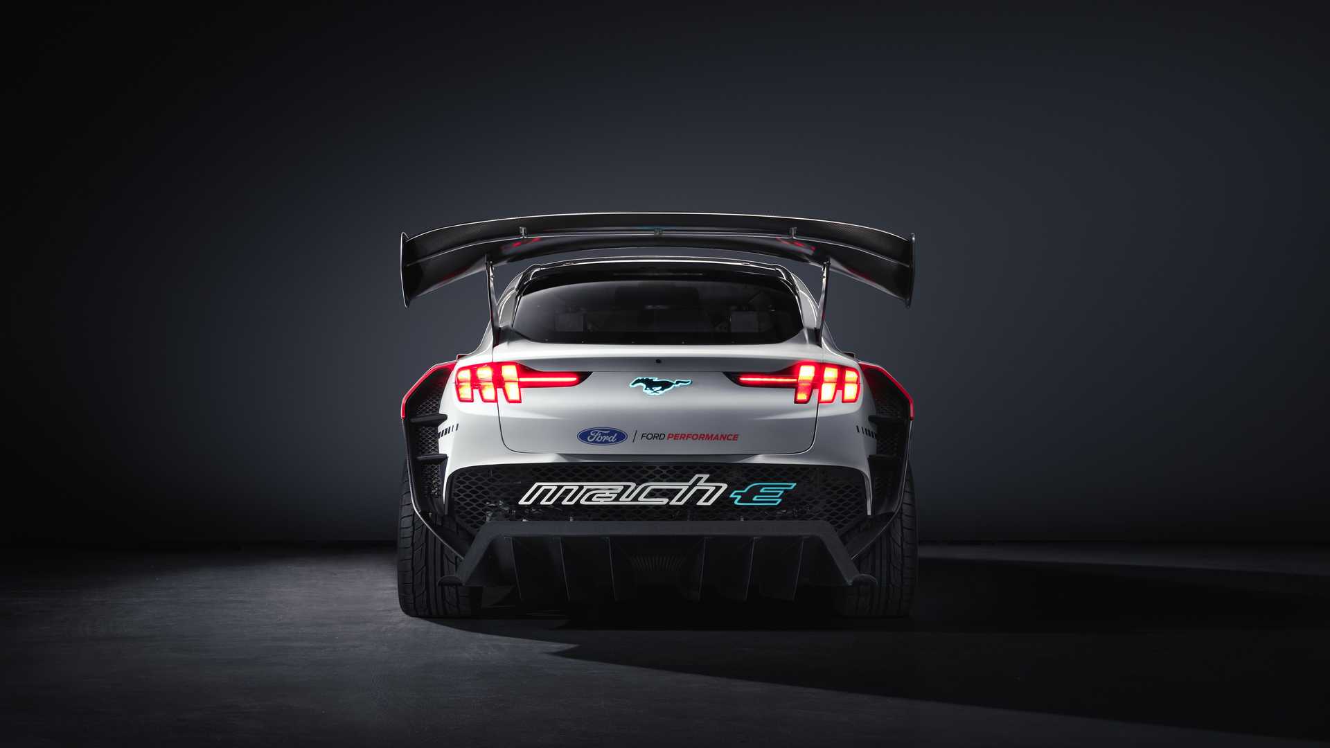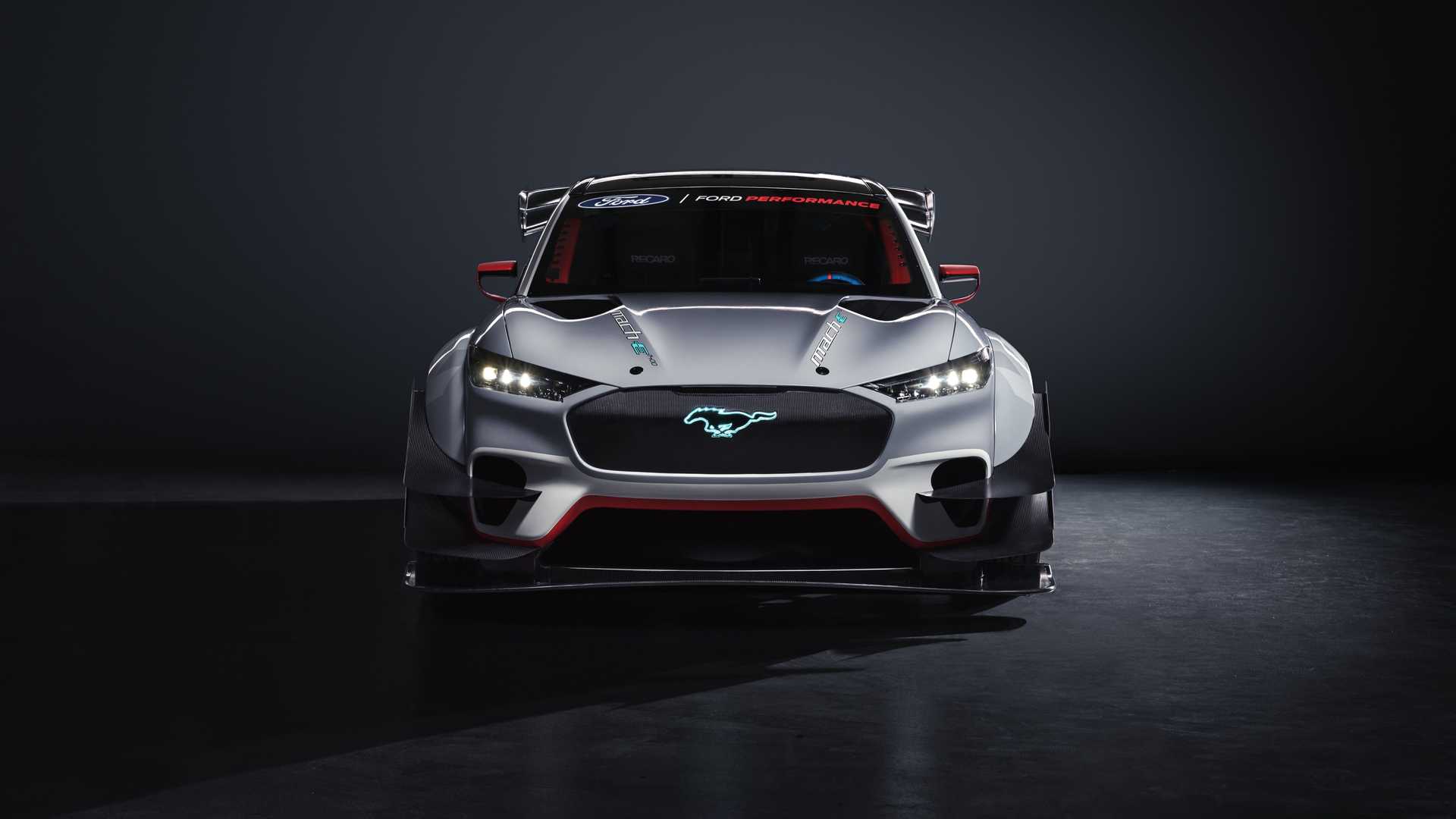 The non-street legal race car features a modified carbon fiber version of the Mach-E production body to improve aerodynamics and handling.