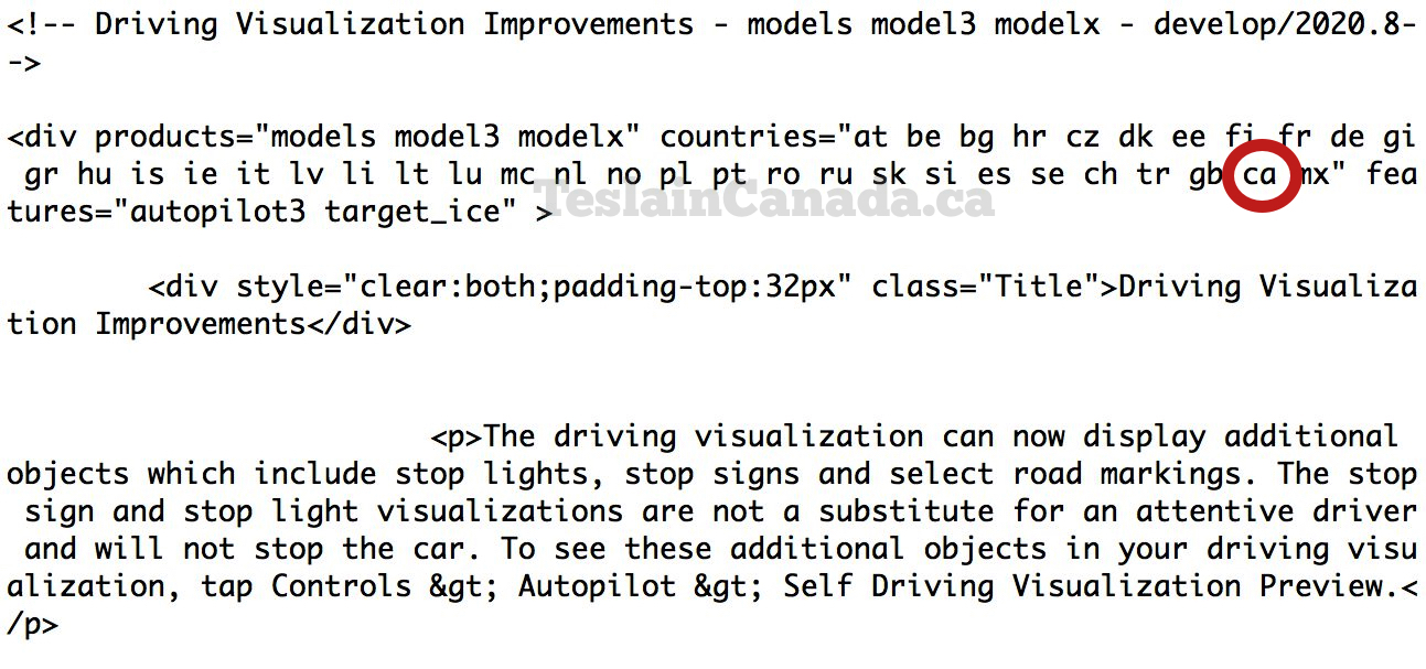 After going through the code of the latest update, @greentheonly found reference to Canada being included in the list of countries slated to get the visualizations, along with the European Union and Mexico (along with a few other things).