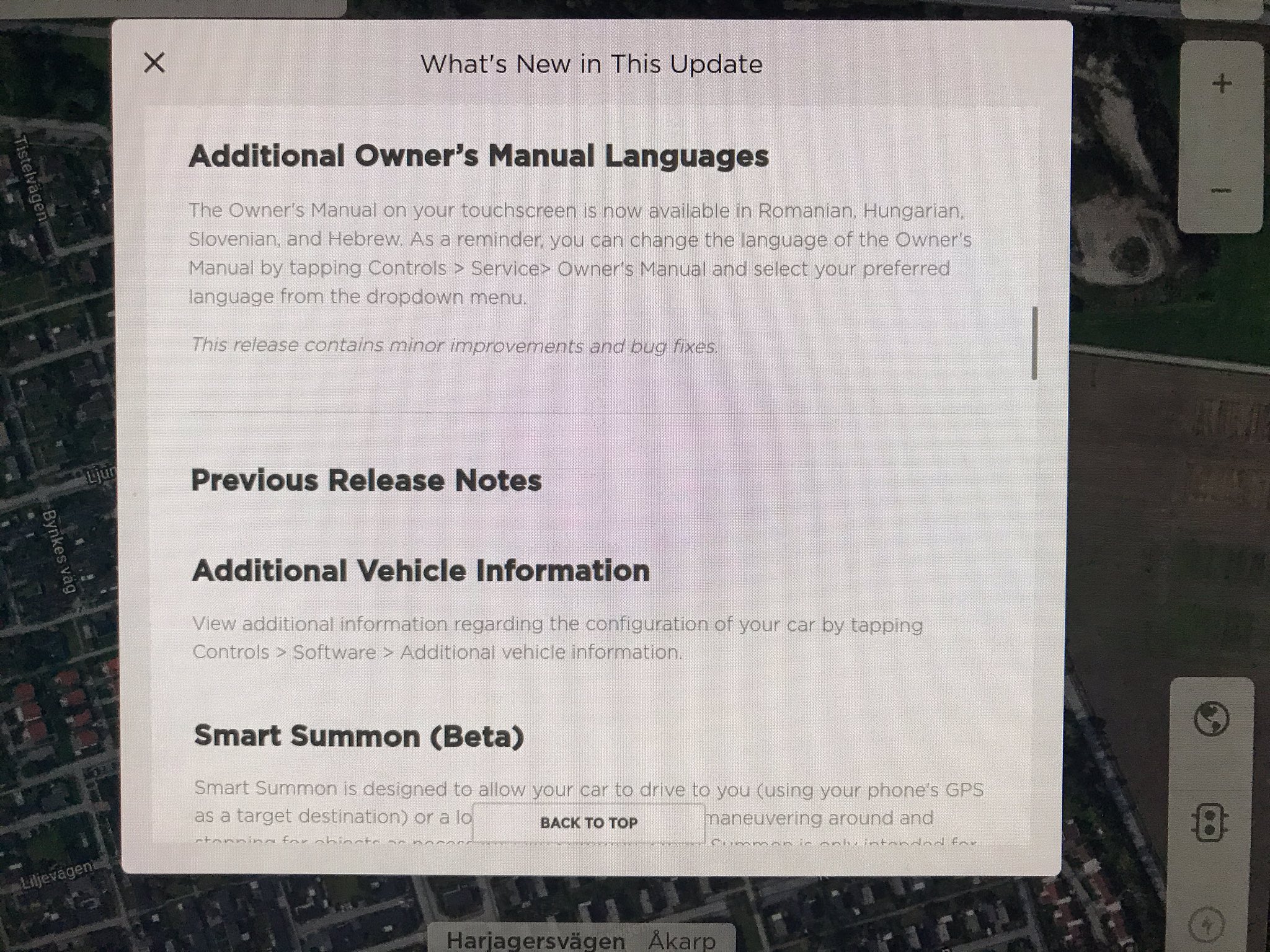 The Owner’s Manual on your touchscreen is now available in Romanian, Hungarian, Slovenian, and Hebrew. As a reminder, you can change the language of the Owner’s Manual by tapping Controls > Service> Owner’s Manual and select your preferred language from the dropdown menu.