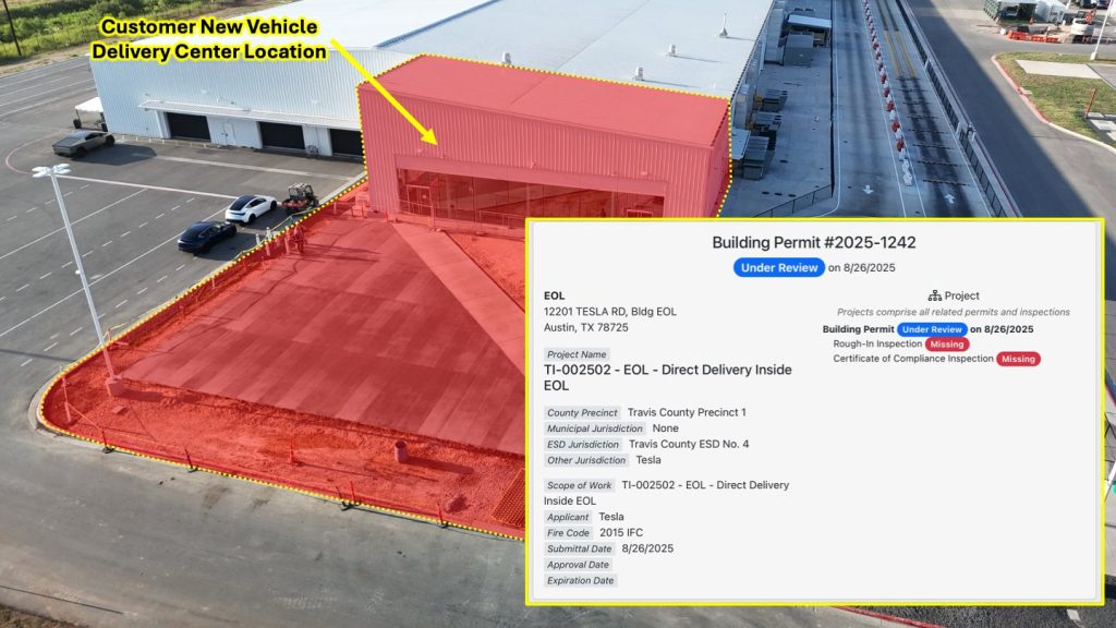 The new Delivery Center is being developed on the north end of the plant’s West End-of-Line building, where completed vehicles roll off the production line. This area will serve as a public-facing delivery hub where customers can finalize paperwork, complete the transfer of ownership, and drive away in their new Tesla.
