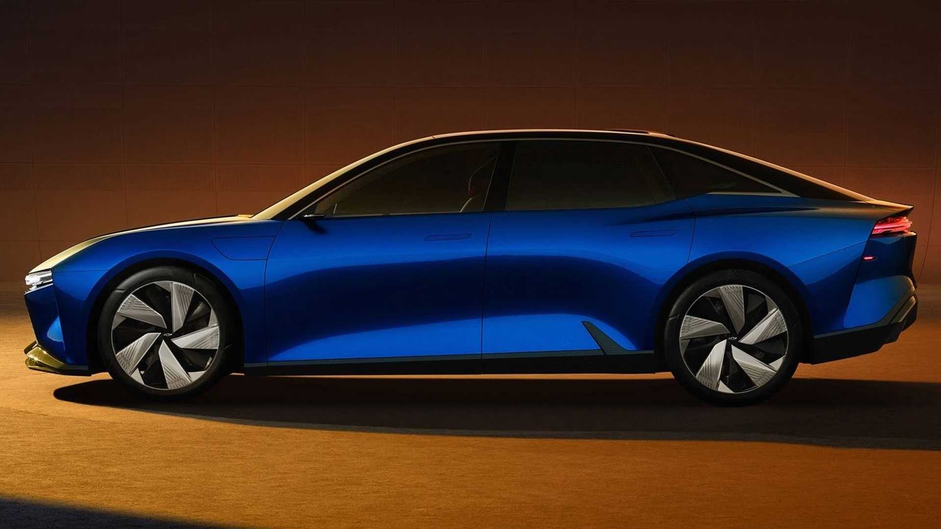 GM describes the Chevrolet FNR-XE concept as its next step toward a greener future. The sedan is based on Ultium technology and uses Ultium batteries. According to GM, the low front end of the car is a homage to the American muscle car line. The slip-back design is meant to minimize wind resistance.