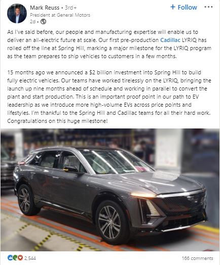 In addition, he announced that the first Lyriq rolled off the Spring Hill production line last week.