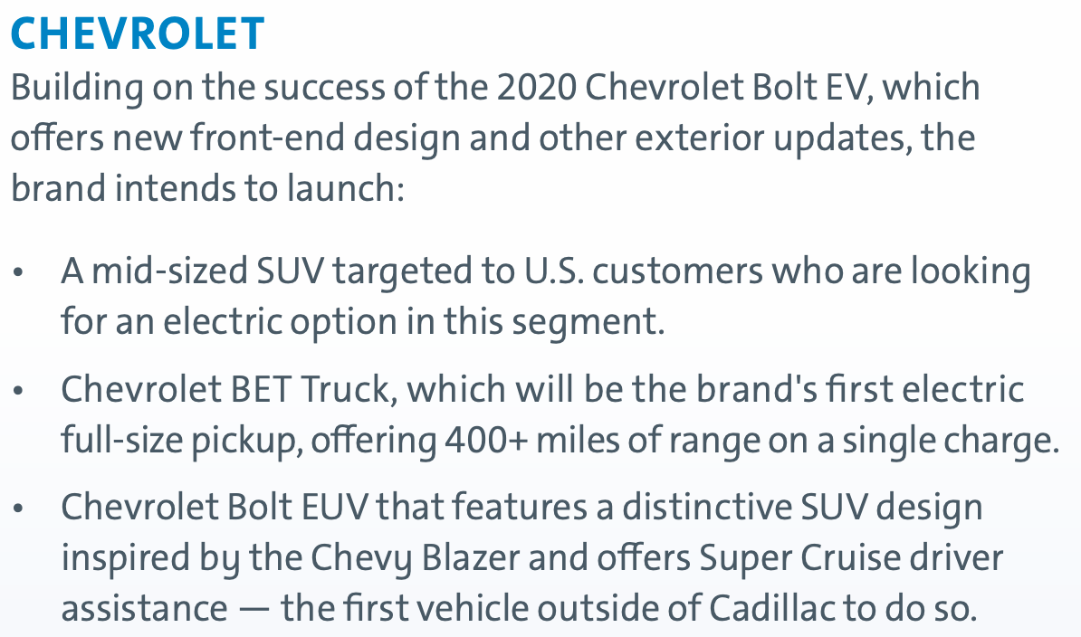 The bullet point you see above is all the information that was revealed in the report. There was no further information on body style (will it be an electric Silverado, their best-selling truck?), or when it will be released.