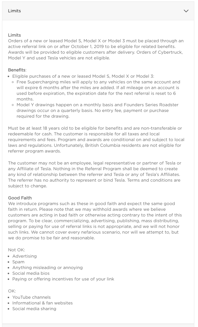 The new Referral Program Limits, found below, no longer reference the stacking of referral credits. They also only refer to referrals made on or after October 1, 2019. There is a “Previous Referral Program” section, which details some of the original referral programs like the Wall Connector and Wheel awards. There is no mention in this section of the referral program above that allowed you to stack your credits.