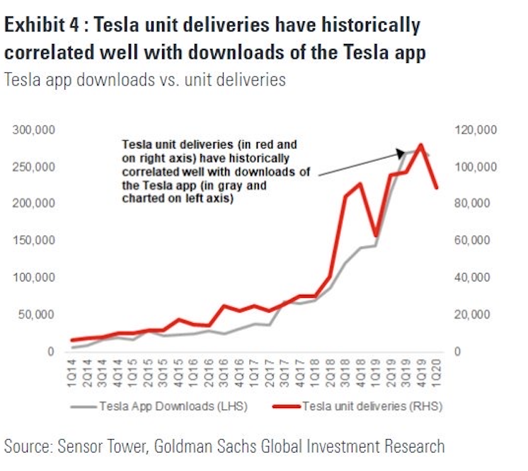 Goldman Sachs, as part of their analysis, took a unique look at the number of Tesla app downloads and charted it against the number of deliveries. Not surprisingly, there was a good correlation between the two as only new owners would be downloading the app. Given the statistics on app downloads are available on a weekly basis, this is a good way to monitor and estimate Tesla’s quarterly results, which Goldman Sachs will continue to do.