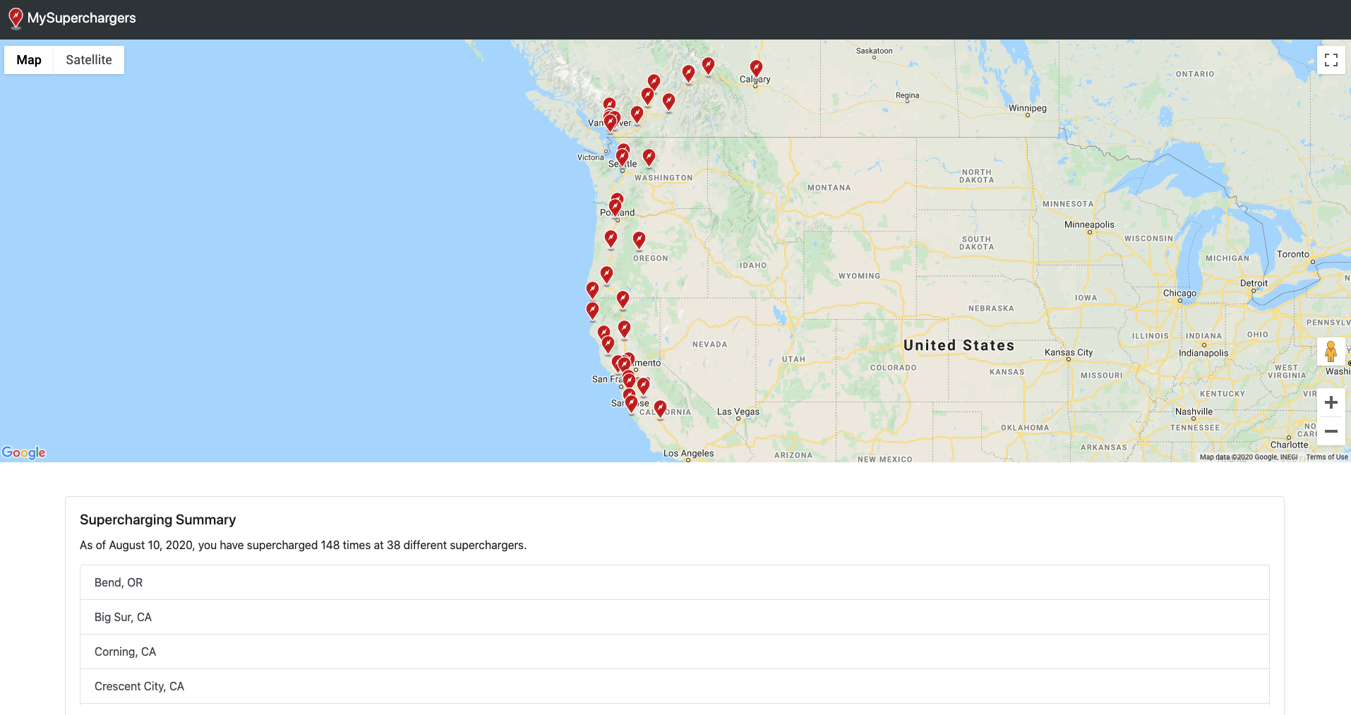 While Tesla does show your Supercharger history in your online account, they don’t show it to you on a map, or give you a summary of how many stations you have visited.