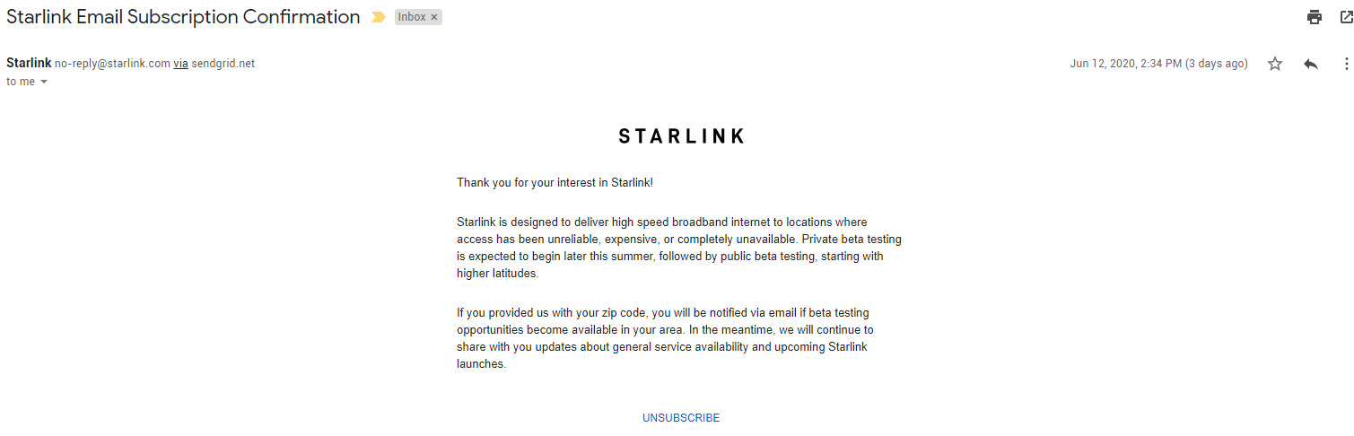 On the front page of the Starlink website, users are invited to enter their email address, postal code and country. Once the information has been submitted, you get a confirmation email stating that if you provided your postal code, you will be notified if beta testing comes to your area. Initial public beta testing will begin with higher latitudes, meaning Canadians have a good shot at being some of the first beta testers.